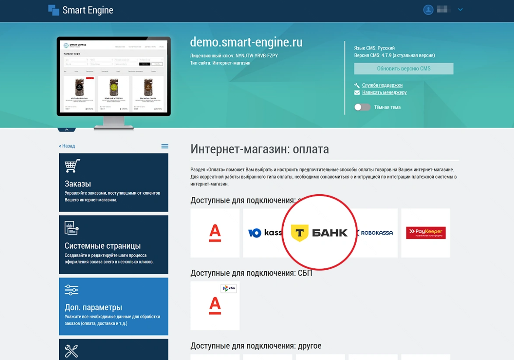 Выберите из списка доступных способов оплат эквайринг от Т-Банка.