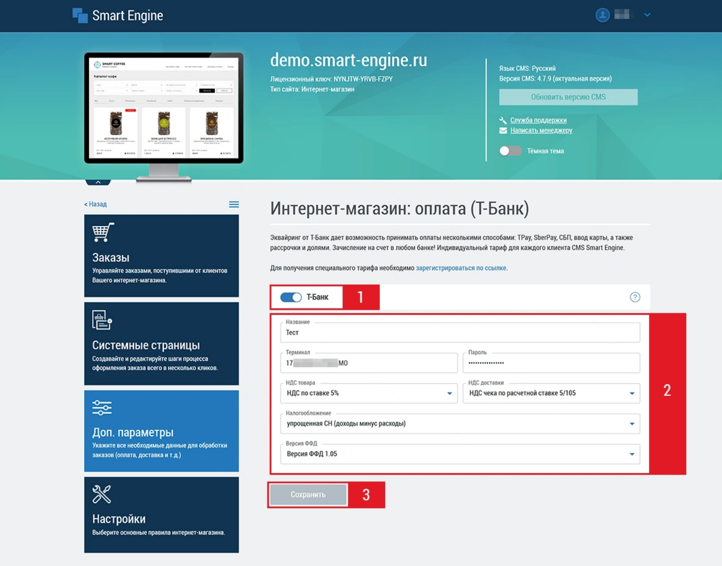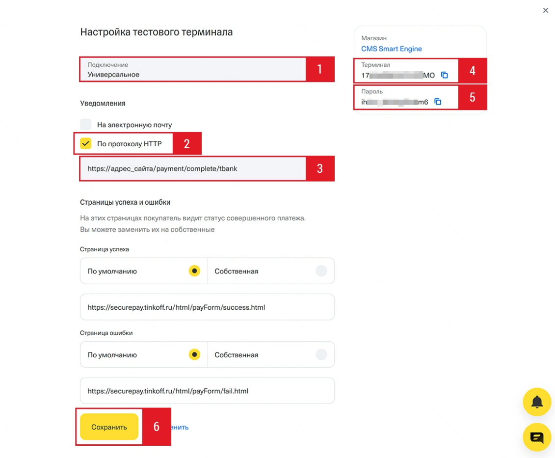 https://адрес_сайта/payment/complete/tbank.Сохраните себе значения полей Терминал и Пароль → нажмите кнопку Сохранить.