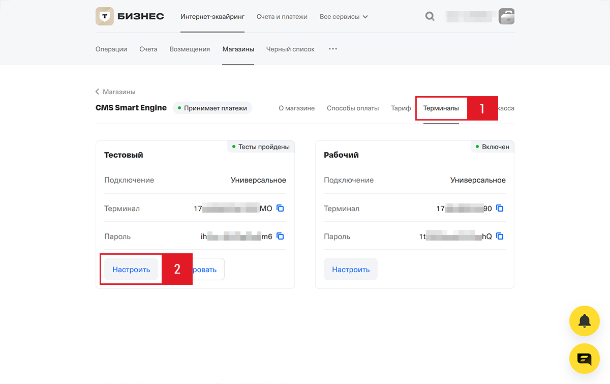 В боковом меню выберите Терминалы и нажмите Настроить в разделе Тестовый. Если вы уже прошли тесты, нажмите Настроить в разделе Рабочий.
